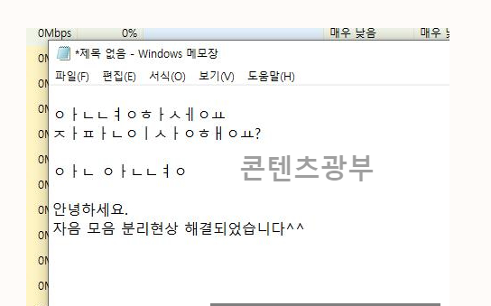 첫 번째 방법으로 해결이 되면 바로 자음 모음 분리 현상 자판 오류가 해결이 된 것입니다.