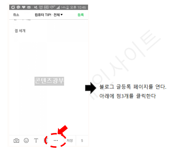 이때 아래쪽에 사진, 이모티콘, T글자폰트종류 그리고 점3개가 보입니다.