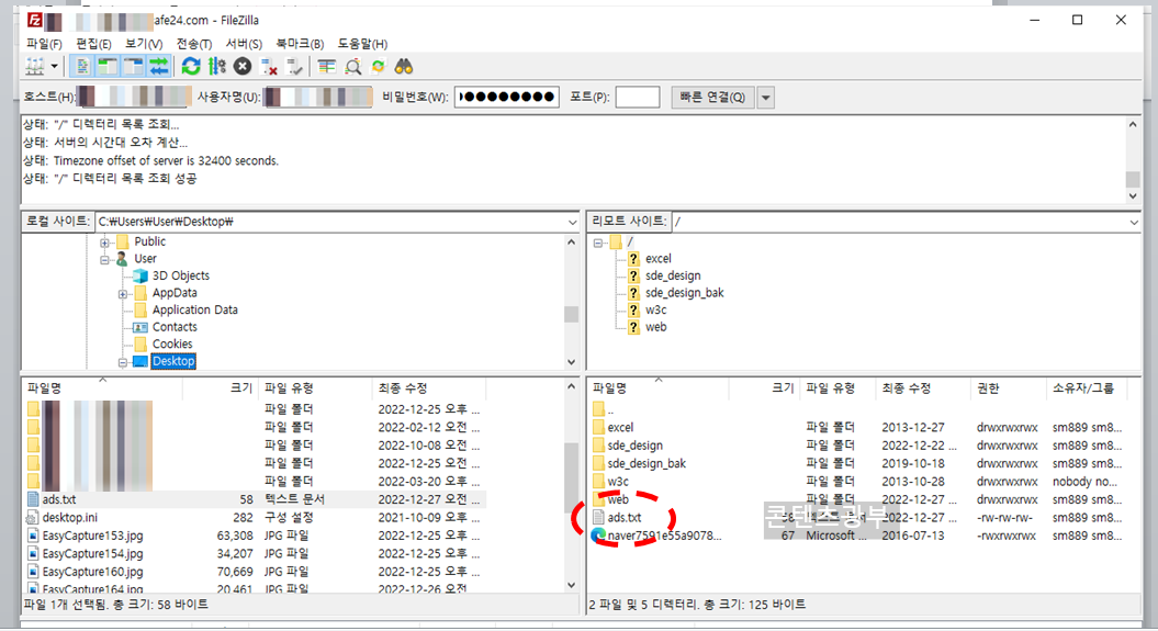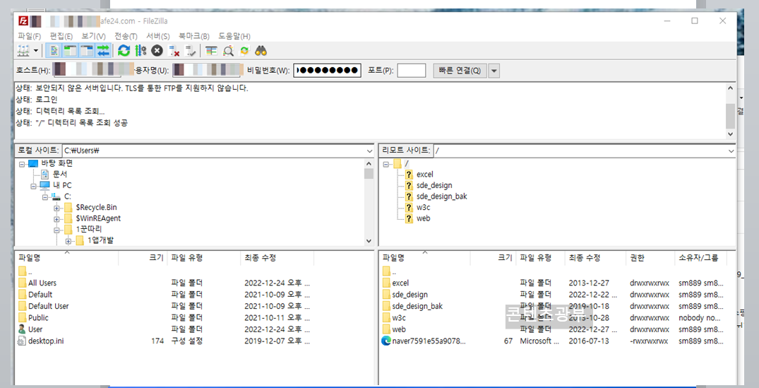 외부 ftp 접속을 위해 위에서 알려든 파일질라로 접속하시면 됩니다.